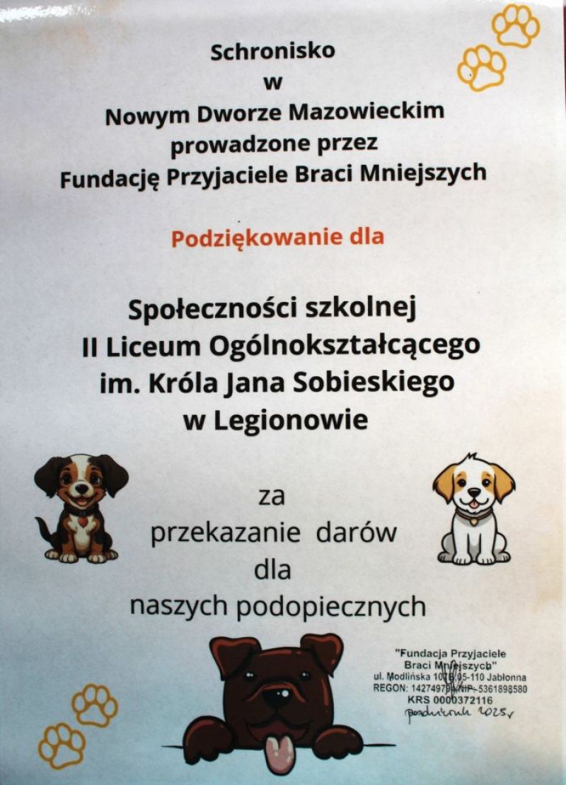 Serdecznie dziękujemy wszystkim Darczyńcom, wspaniałym Uczniom, którym nie jest obojętny los bezdomnych zwierząt oraz ich Rodzicom. Dziękujemy również Nauczycielom i Pracownikom obsługi, którzy hojnie włączyli się w naszą zbiórkę. Zwierzęta ze schroniska w Nowym Dworze Mazowieckim otrzymały już od nas karmę i ciepłe okrycia. W piątek 7 listopada 2025 wszystkie dary trafiły do Nowego Dworu Mazowieckiego. Najpiękniej dziękujemy Pani Annie Konarzewskiej za przewiezienie darów swoim autem do schroniska. A było tego sporo: 33,026 kg karmy oraz całe mnóstwo koców, ręczników, kołderek.