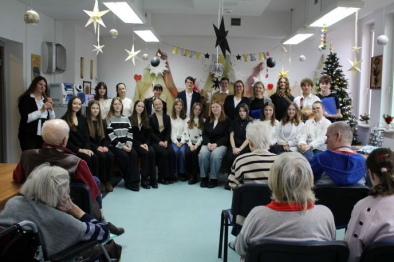 W dniu 8 stycznia 2026 nasz uczniowsko – nauczycielski chór szkolny pod dyrekcją Pani Anny Grabowskiej wystąpił w Domu Pomocy Społecznej Kombatant w Legionowie. Noworoczny koncert kolęd i pastorałek był pełen pięknych brzmień, wspaniałej recytacji, ciepłych życzeń dla Seniorów. Przy akompaniamencie pianina, gitary, skrzypiec i fletu prostego głosy chórzystów zabrzmiały tak doskonale, że nasi Gospodarze nie chcieli nas wypuścić…