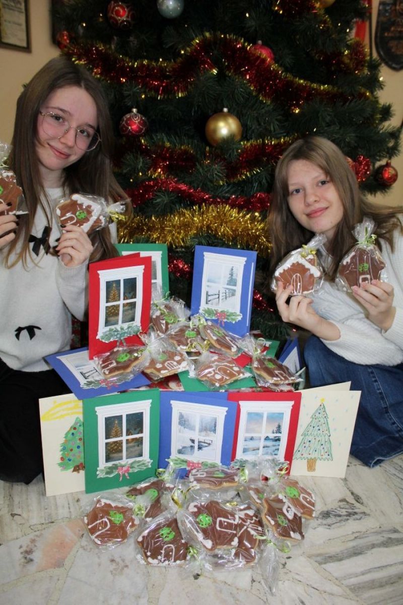 Na zakończenie spotkania wolontariuszki wręczyły Seniorom własnoręcznie zrobione kartki świąteczne (dzieło Igi i Matviego) oraz pyszne pierniczki autorstwa Zosi.