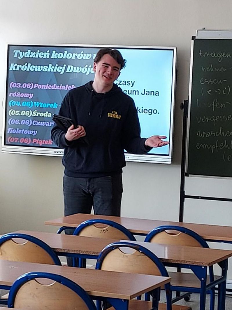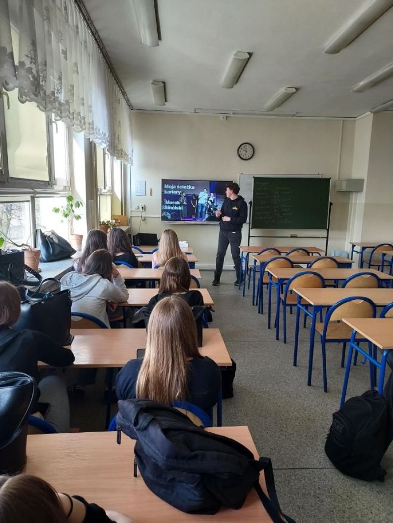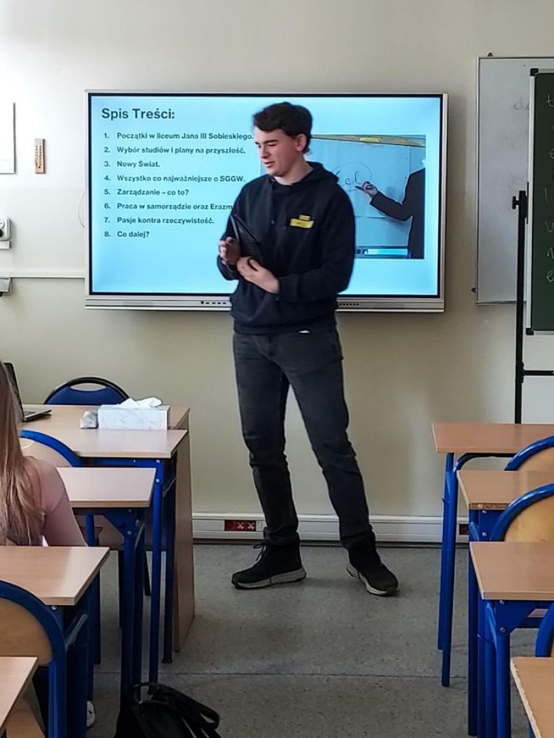 13 marca 2026 r., w ramach spotkań z zakresu doradztwa zawodowego, gościliśmy w naszym liceum pana Marka Smólskiego – studenta trzeciego roku Wydziału Ekonomicznego Szkoły Głównej Gospodarstwa Wiejskiego w Warszawie (SGGW), który studiuje na kierunku zarządzanie. Pan Marek spotkał się z uczniami klasy 3a i 3f o profilu europejskim oraz klasy 3e o profilu psychologicznym, którym opowiedział o specyfice studiów na kierunku zarządzanie i perspektywach pracy po ich ukończeniu. Podczas spotkań uczniowie zostali również zapoznani z ofertą edukacyjną SGGW, w tym Wydziału Ekonomicznego tej uczelni.